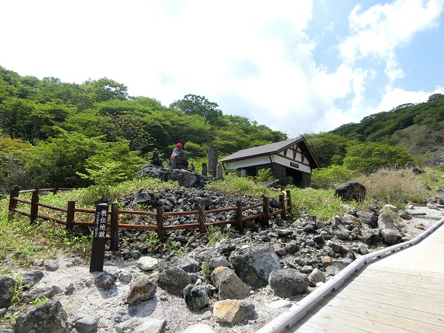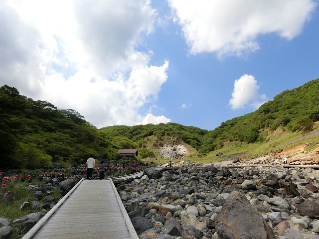 那須湯元温泉② 那須街道を抜けて付いた先 すごい硫黄のにおい(*´Д`) 殺伐とした岩場と数多くのお地蔵さま 木道が敷かれているので歩きやすいです。 九尾の狐の伝説の地なんだ。。。 それにしても、清清しい! 青い空と濃い緑の樹々、 両手を広げて深呼吸しました♪ JR黒磯駅から東野バス那須ロープウェイ行きにて40分。 ロープウェイ乗り場にも行きましたが 載らなくても充分! 景色を堪能して山を下りました。 高所恐怖症。。。(>_<)