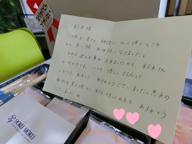 感激(*’▽’) 晴天♪ 大安の本日、滞りなくご決済を終えられたお客様! 「おめでとうございます!」 笑顔いっぱいのご家族で、いつも元気をもらっていたのに お礼の品までいただいてしまいました YOKU MOKUの詰め合わせ♪ お祝いやお返しに送ることはあっても、 なかなか自分のためには買わない逸品! 葉巻型のシーガル、美味しいですよね~ シャインマスカットも大好き! (⋈◍>◡<◍)。✧♡ お礼のお手紙が添えられていました ありがとうございます! また、いつでも遊びに来てくださいね(*’▽’)