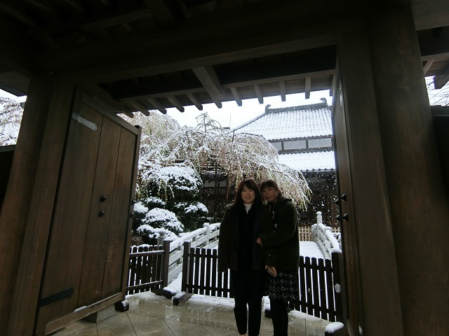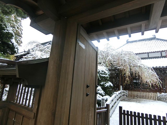 真白な境内に立派な枝垂桜!