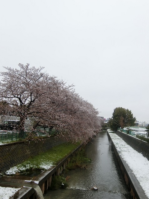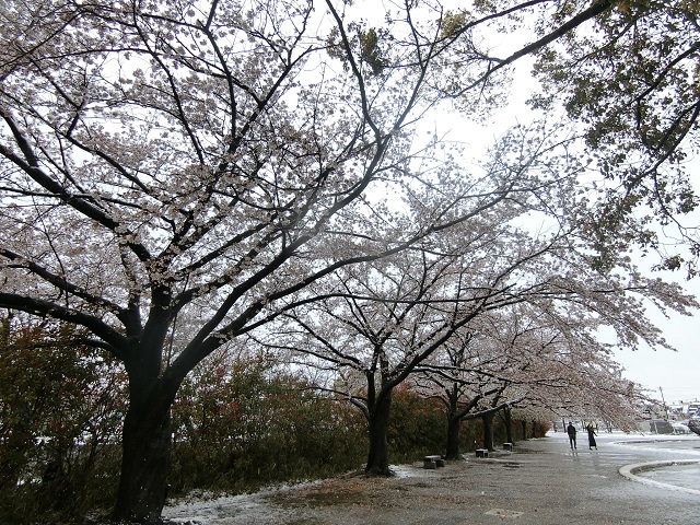 舞い散っているのは桜の花びらか雪か、