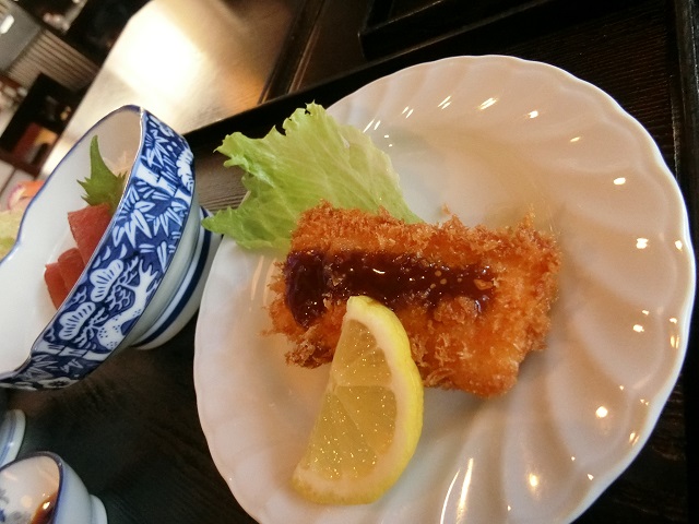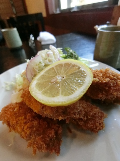 店員さんに「カキフライにもサラダが載ってますよ」と、