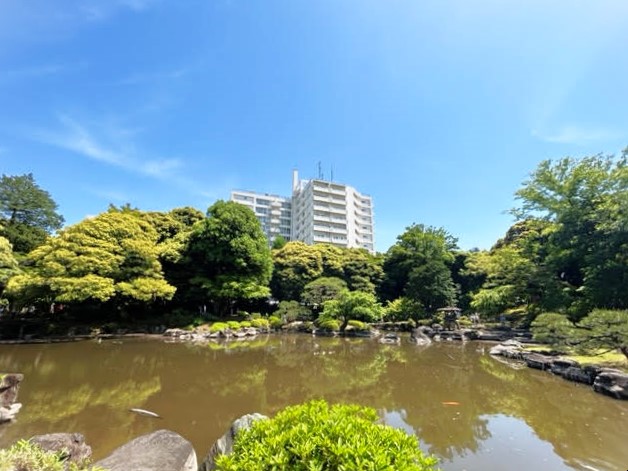 庭園の奥に堂々とそびえるマンション撮影