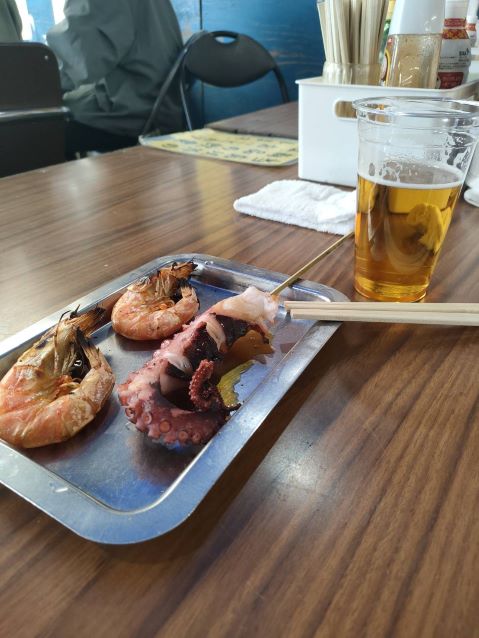 市場でイカやエビ、